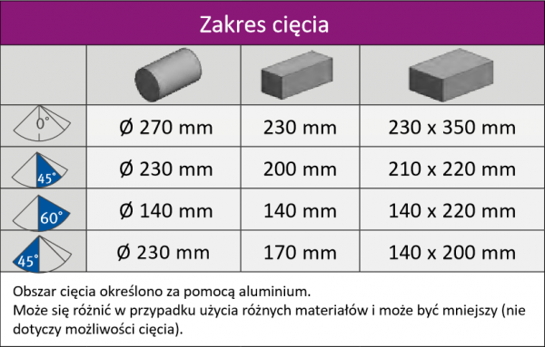 | Kąt cięcia: | -45 stopni do 60 stopni |