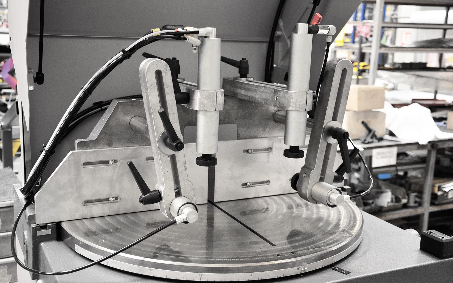 Półautomatyczna piła tarczowa przeznaczona do cięcia profili oraz pełnych materiałów ze stopów aluminium, miedzi i twardych tworzyw sztucznych. Maszyna wyposażona jest w pionowe dociskacze pneumatyczne do bezpiecznego mocowania obrabianego materiału. Ze względów bezpieczeństwa lewe urządzenie mocujące jest wyposażone w zawór zwrotny, który radzi sobie z ewentualnymi spadkami ciśnienia powietrza.