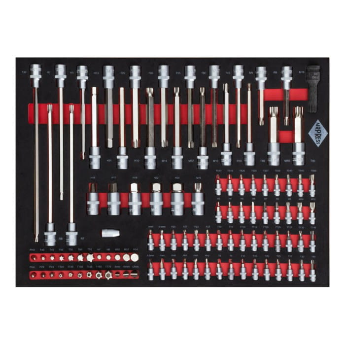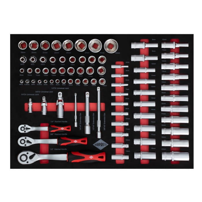 Każdy moduł narzędziowy umieszczony jest w wkładach piankowych odpornych na olej, co ułatwia czyszczenie i zapewnia długą trwałość. Oznaczenia przy każdym elemencie umożliwiają szybkie znalezienie odpowiedniego narzędzia, co poprawia efektywność pracy i utrzymanie porządku w warsztacie.