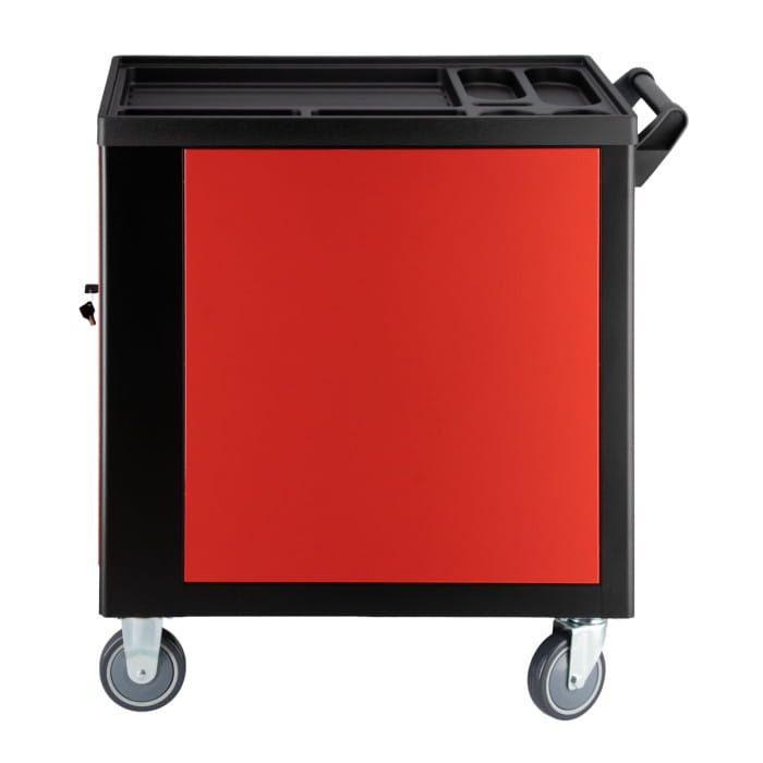 Zamykaną szafkę z regulowanymi haczykami i półką po prawej stronie wózka, co zapewnia dodatkową przestrzeń do przechowywania akcesoriów oraz narzędzi.