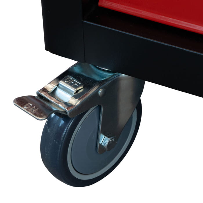 Solidna konstrukcja wózka zapewnia jego stabilność i mobilność, umożliwiając swobodny transport narzędzi, dzięki 4 kołom (2 skrętne, jedno z hamulcem).