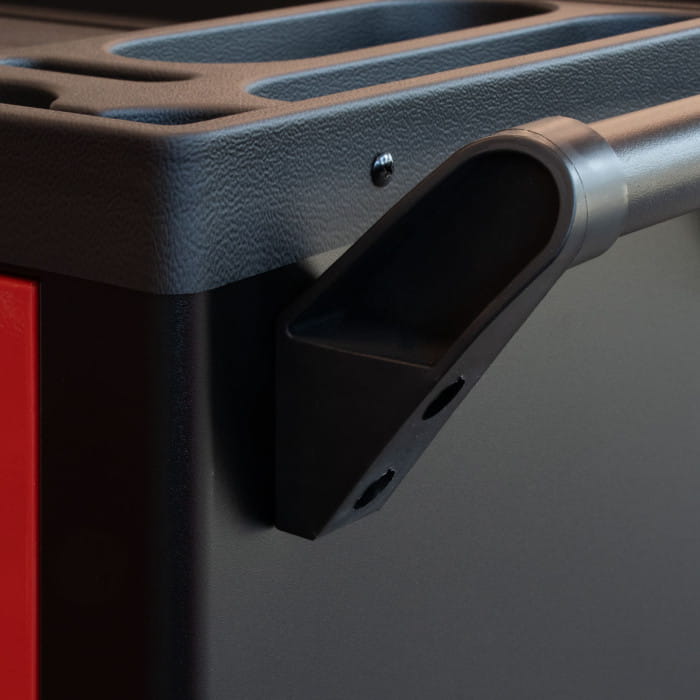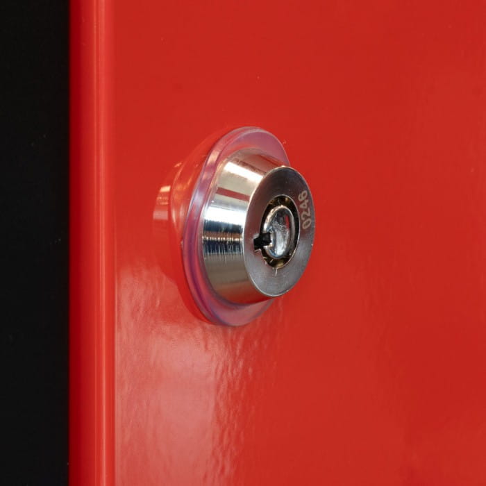 Górna szuflada wyposażona jest w zamek centralny, który umożliwia bezpieczne przechowywanie narzędzi.