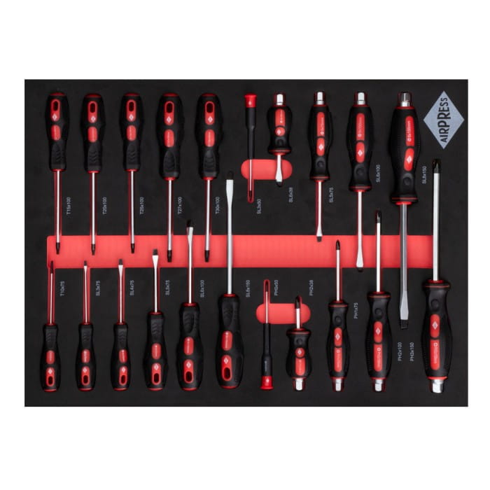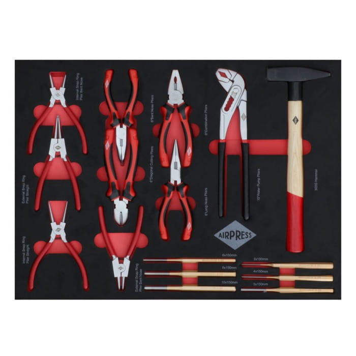 Narzędzia umieszczone w wytrzymałych wkładach piankowych, odpornych na olej, co zapewnia łatwe czyszczenie i długotrwałą ochronę narzędzi.