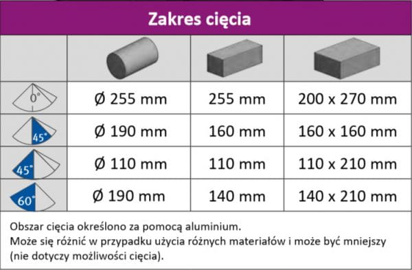 | Kąt cięcia: | 45° do -60° |