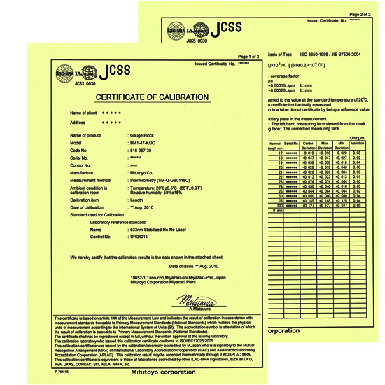 *Płytki wzorcowe dostarczane są ze świadectwem sprawdzenia JCSS (Japan Calibration Service System). Świadectwo sprawdzenia JCSS porównywalne jest ze świadectwem DAkkS COFRAC, RVA czy UKAS. Te wyniki kalibracji akceptowane są międzynarodowo.