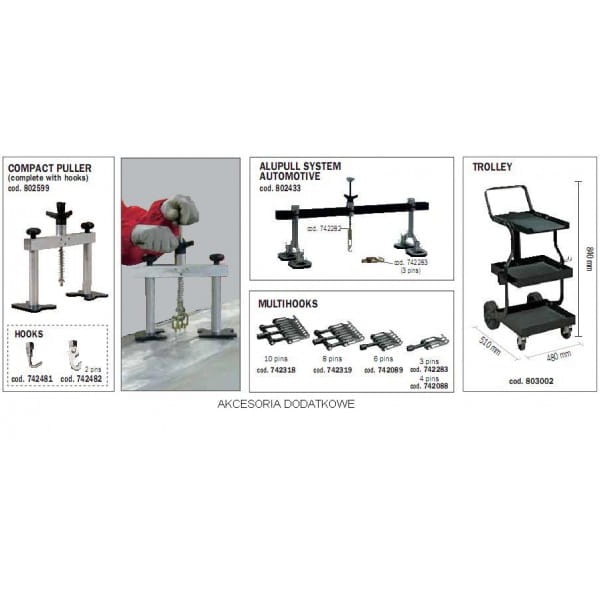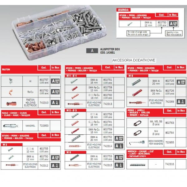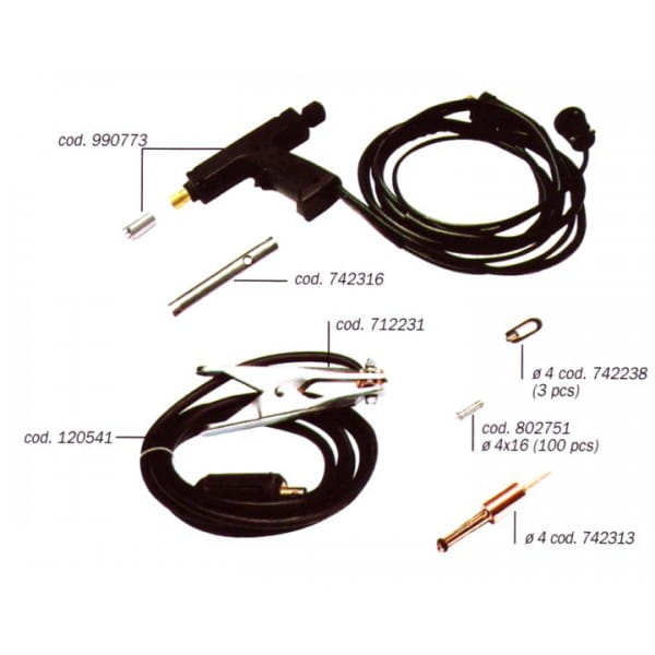 Na wyposażeniu zestaw narzędzi przeznaczony do zgrzewania punktowego trzpieni gładkich i z zewnętrznym gwintem.